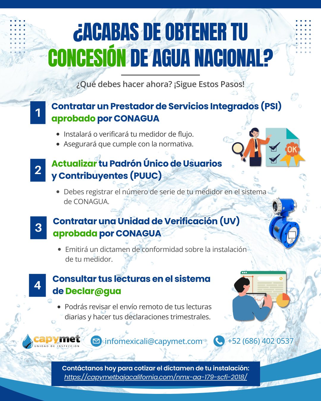 1. Contratar un Prestador de Servicios Integrados (PSI) aprobado por CONAGUA para instalar o verificar tu medidor.